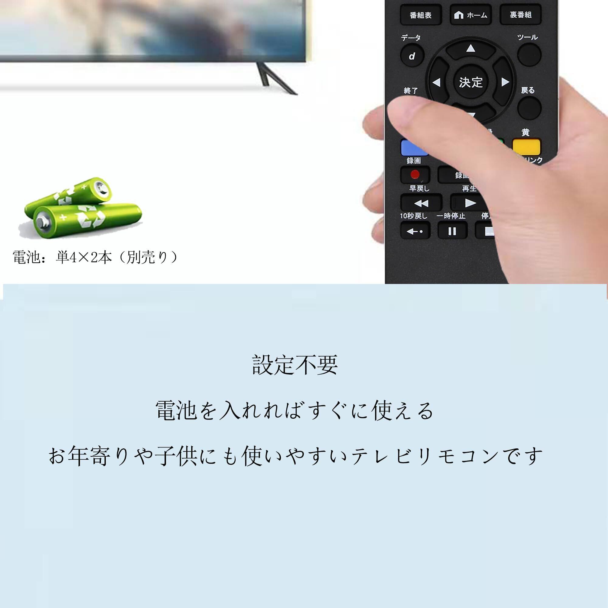 設定不要:何も設定しなくても、電池を入れればすぐに使える、お年寄りや子供にも使いやすいテレビ リモコンです。* 単4電池2本(別売)使用。