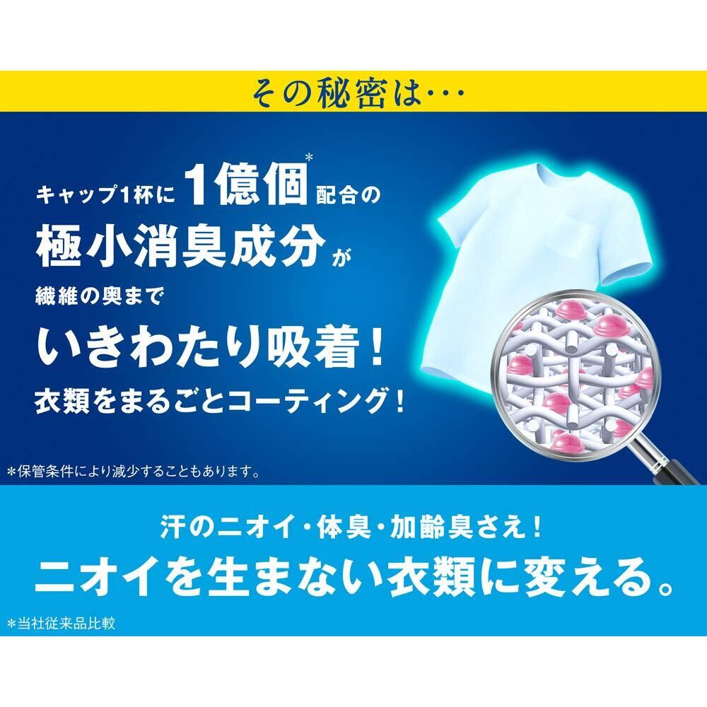 キャップ一杯“1億個"の極小消臭成分が、繊維の奥にまで入り込み吸着。1日中消臭パワーが続くから汗のニオイ・体臭・加齢臭、帰宅時の靴下臭さえ、夜までニオイを発生させない。