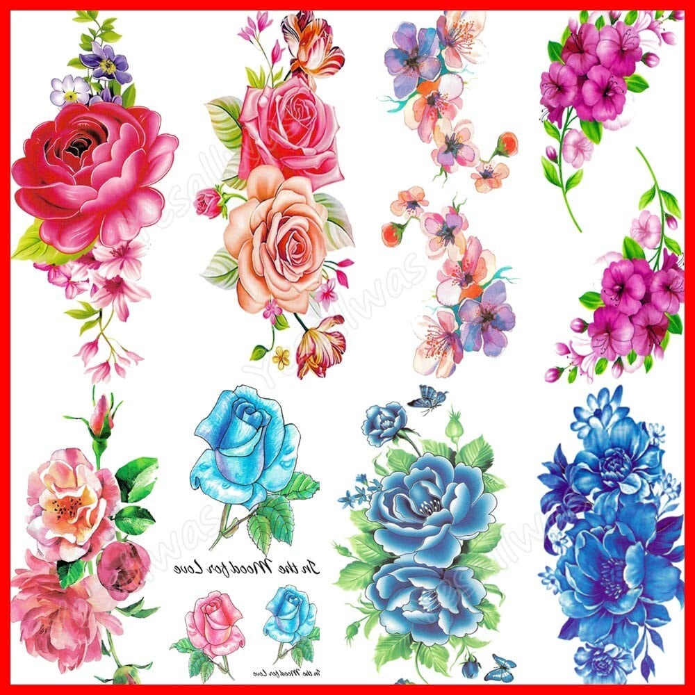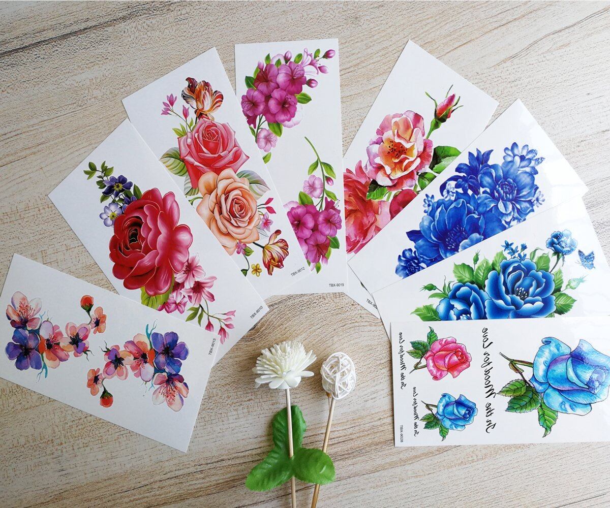 【セット内容】タトゥーシール 花 、8枚セット。8種類、各1枚。【サイズ】:約9cm×19cm(絵柄台紙部分)。