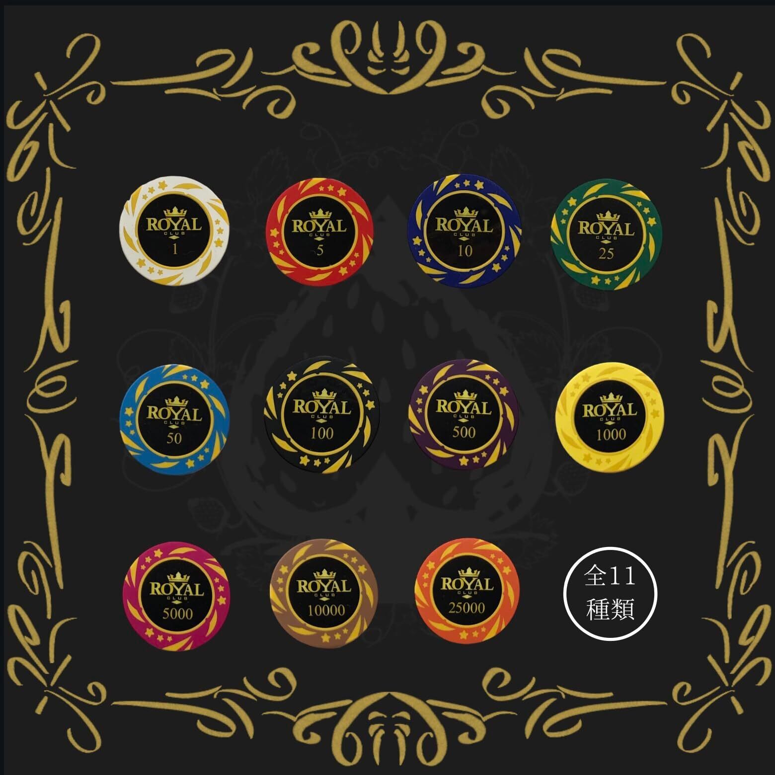 ・ROYAL ポーカーチップ ・ポーカーゲームやカジノゲームで使用するチップ(コイン)になります。 ・サイズ:直径40mm×厚さ3mm ・重量:約14g ・材質:粘土、鉄 ・1点〜25000点の11種類と幅広いチップを取り扱っておりますので、ホームゲームから大規模なトーナメント大会まで楽しむことができます。 また、ポーカーゲームやカジノゲームだけでなく、ボードゲームなどでも大活躍します。 ・約14gと程よい重さがあり、安物とは違った高級感ある造りとなっています。 チップシャッフルの練習にも最適です。 ・ゴルフマーカーにも使用可能です。 ・W&Berryオリジナルシールパッケージにて発送いたします。